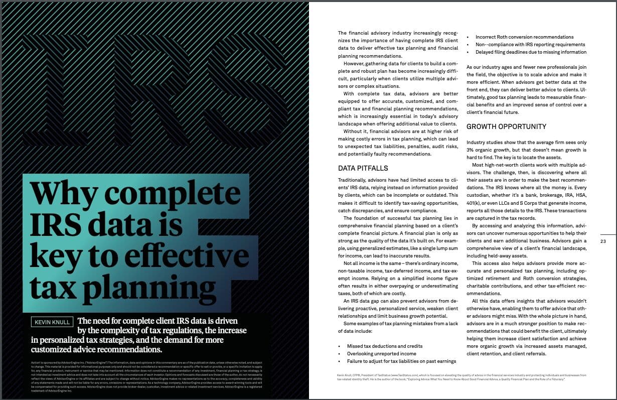 TaxStatus CEO Kevin Knull, CFP® authored this article for AdvisorEngine's Action! Magazine, highlighting the need for financial advisors to have comprehensive data in order to provide their clients with customized tax strategies and personalized financial advice.