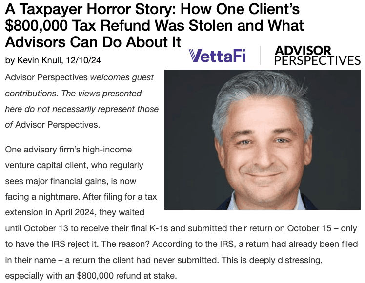 TaxStatus President Kevin Knull, CFP® wrote this bylined article in Advisor Perspectives by VettaFi, where he provides a worst-case scenario in which an advisory firm’s high-income venture capital client had their substantial tax refund stolen by fraudsters. Kevin provides proactive strategies and solutions on how financial advisors can help protect their clients from tax fraud and tax-related identity theft.