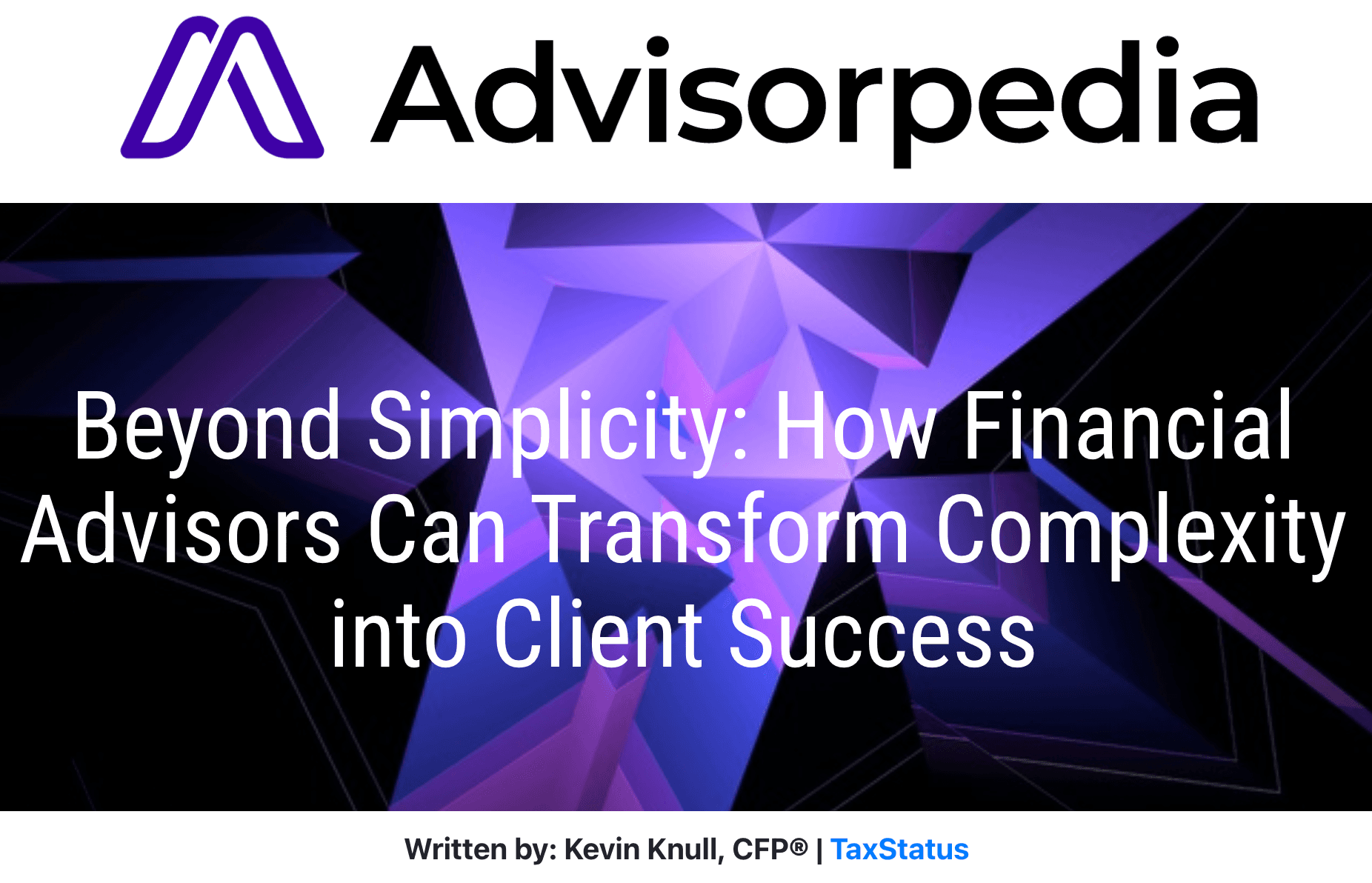 TaxStatus president Kevin Knull, CFP® authored this article for Advisorpedia, discussing why financial advisors should focus on delivering meaningful simplification for clients - an approach that transforms complexity into actionable insights while leveraging all relevant data.