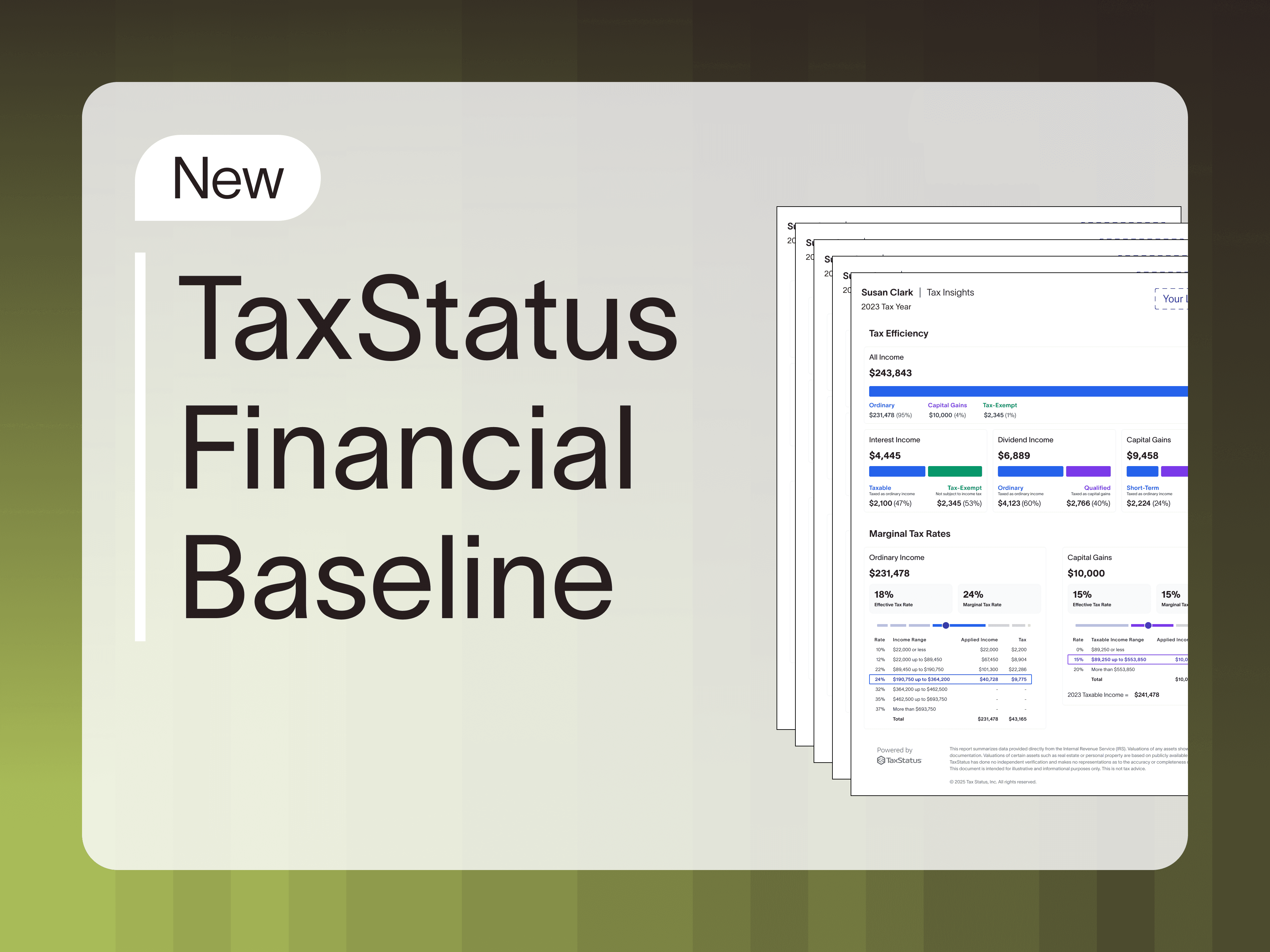 The Financial Baseline Report is now available to all TaxStatus users as a deliverable for both clients and prospects, and the data is available to TaxStatus enterprise clients via API. To learn more, visit www.TaxStatus.com.