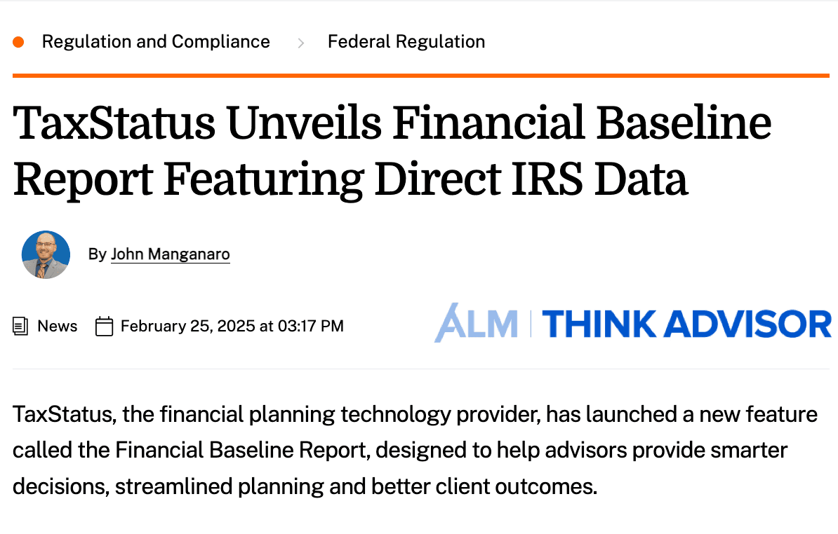 In this article from ThinkAdvisor, Kevin Knull expounds on the numerous advantages that the new TaxStatus Financial Baseline Report will provide for the financial planning industry: “We believe the Financial Baseline Report will completely transform financial planning - making firms more efficient, improving the quality of advice, and ultimately helping advisors deliver better client outcomes.”